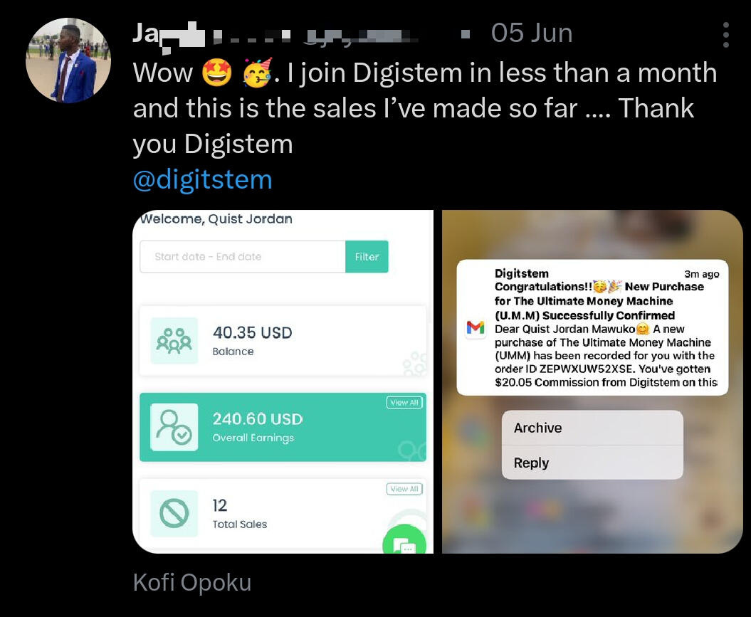 So For You to Get Access to Digitstem You Will Need to Have Access to The Ultimate Money Machine Course, Digitstem Made It This Way so That Beginners Can Start in a Very Simple Way. So Start Affiliate Marketing Today. Now What What Are The Benefits Of Affiliate Marketing, Before We Continue Let Me Briefly Show You Some Of The Awesome Results People Are Getting From Digitstem Affiliate Marketing.